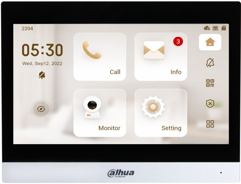 Vnitřní zobrazovací jednotka IP videotelefonu s barevným dotykovým displejem. Možnost zapojení po LAN síti nebo jako 2 vodičový systém za pomoci VTNS jednotky. Obousměrná audio komunikace s venkovními jednotkami VTO přes SIP protokol. Možnost připojení IPC kamer Dahua. Otevírání elekrického zámku. Relé vstupy/výstupy. Nástěnná montáž.