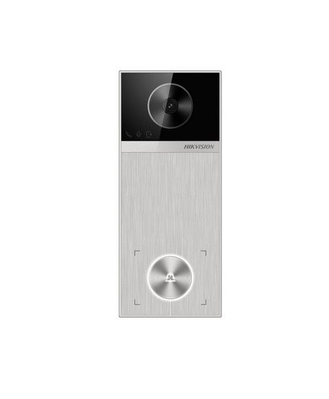 Dveřní IP stanice s kamerou a 1-tlačítkem, IP systém videotelefonů Hikvision, plastové provedení, povrchová instalace, umožňuje přímé volání na mobilní telefon prostřednictvím cloudové služby od Hikvisionu a mobilní aplikace Hik-Connect, kamera má funkci WDR a rozlišení 4 Mpx (2688x1520), horizontální úhel záběru 150°, vertikální úhel záběru 75°, IR přísvit až 3 metry, rozhraní LAN 10/100 Mbps, kapacita karet/čipů max 10000,kapacita uživatelů max 2000, slot na microSD kartu max. až 128GB, 1x RS485, 1x odchodové tlačítko, 4x alarm IN, RFID čtečka čipů/karet Mifare (13,56MHz), 2x NO/NC kontakt pro zámek(pro napájení zámku nutné použít externí napájecí zdroj), napájení 12V DC/1,2A/10W nebo standardní PoE IEEE802.3at, IP65, provozní teplota -40°C až +60°C, krytí IP65, rozměry: 164 mm × 69 mm × 24.7 mm, hmotnost 431g,