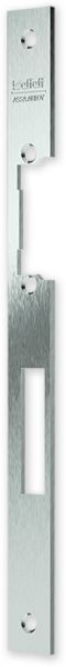 Levo/pravý úzký čelní plech s plochým profilem, pro zámky řady effeff, s otvorem pro západku a výřezem pro závoru. Univerzální použití.