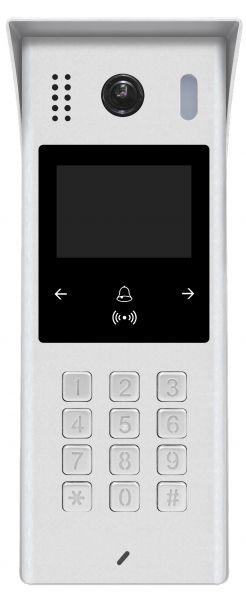 Dveřní stanice pro povrchovou montáž vybavená kamerou se StarLight čipem, LED přísvitem se senzorem setmění. Integrovaná RFID čtečka umožňuje otevření zámku pomocí čipu/karty. Klávesnice slouží pro otevření zámku zadáním kódu a volání účastníka pomocí kódové volby. Volání lze také uskutečnit výběrem ze jmenného seznamu účastníků na displeji. Součástí balení je povrchová stříška.