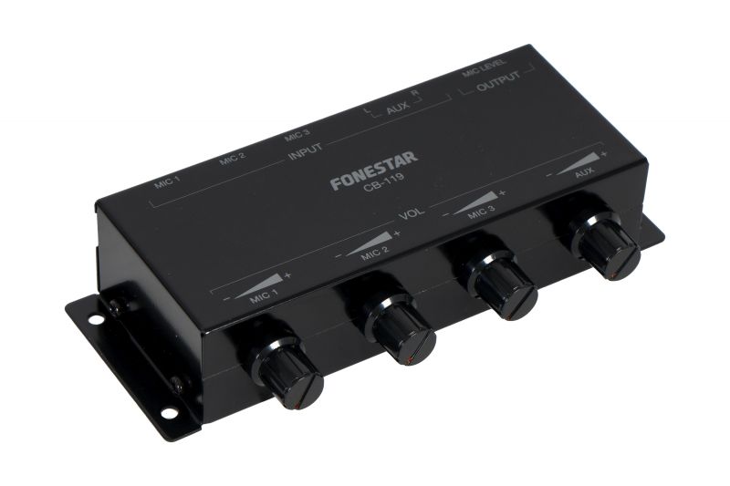 Fonestar CB-119 je kompaktní analogový mono mixér se 3 mikrofonními vstupy a 1 stereo pomocným vstupem. Nabízí výstup na úrovni MIC pro snadné připojení k mikrofonnímu vstupu zesilovače nebo mixpultu, ideální pro menší ozvučovací aplikace.
