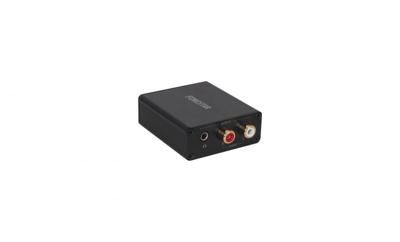 Digitálně-analogový audio převodník se sluchátkovým výstupem. Vstupy pro optický a koaxiální digitální zvuk. Malá velikost, snadná instalace a použití. Digitálně-analogový audio převodník FO-41DAH je určen pro domácí nebo profesionální audio aplikace. Převádí digitální, Toslink nebo koaxiální audio vstupní signál z TV nebo digitálního přehrávače na analogový audio signál pro připojení stereo sluchátek a externího zesilovače současně. Tento převodník má mnoho funkcí, které poskytují vysoce kvalitní zvuk. Převádí PCM digitální optický nebo SPDIF koaxiální audio vstup na stereo L/R analogové výstupy. Podporované vzorkovací frekvence zahrnují 32 kHz, 44,1 kHz, 48 kHz, 96 kHz a 192 kHz s až 24bitovým rozlišením. Vysoce věrný design s ultra nízkým kolísáním pomocí nových přijímacích čipů a D/A převodníků. Odolný hliníkový kryt. Rychlá plug and play instalace.