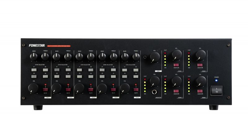 Fonestar MAZ-0604 je vícekanálový a maticový PA zesilovač s výkonem 4 × 60 W RMS, který umožňuje přehrávání různých hudebních zdrojů v jednotlivých zónách. Nabízí čtyři výstupní kanály s nezávislými zesilovači a maticovým směrováním vstupů, takže každá zóna může mít vlastní hudbu i úroveň hlasitosti. Díky podpoře 100 V linky i nízkoimpedančního výstupu je ideální pro profesionální instalace ve školách, kancelářích, obchodech nebo průmyslových areálech.