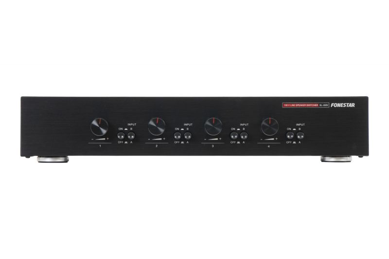 Fonestar SL-400V je čtyřkanálový 100 V monofonní volič reproduktorů s nezávislým ovládáním hlasitosti a volbou vstupu. Umožňuje připojení až čtyř reproduktorových okruhů na dva výstupy zesilovače. Vhodný pro vícezónové ozvučovací systémy a profesionální instalace, kde je požadováno lokální řízení hlasitosti a výběr zdroje signálu.
