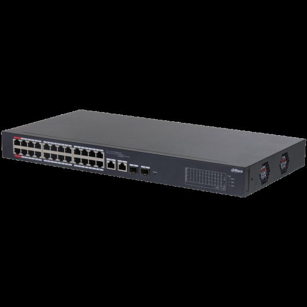 Popis portů: 24 x PoE 10/100 Mbps, 2 x uplink 10/100/1000 Mbps (combo), 2 x SFP 1000 Mbps (combo)